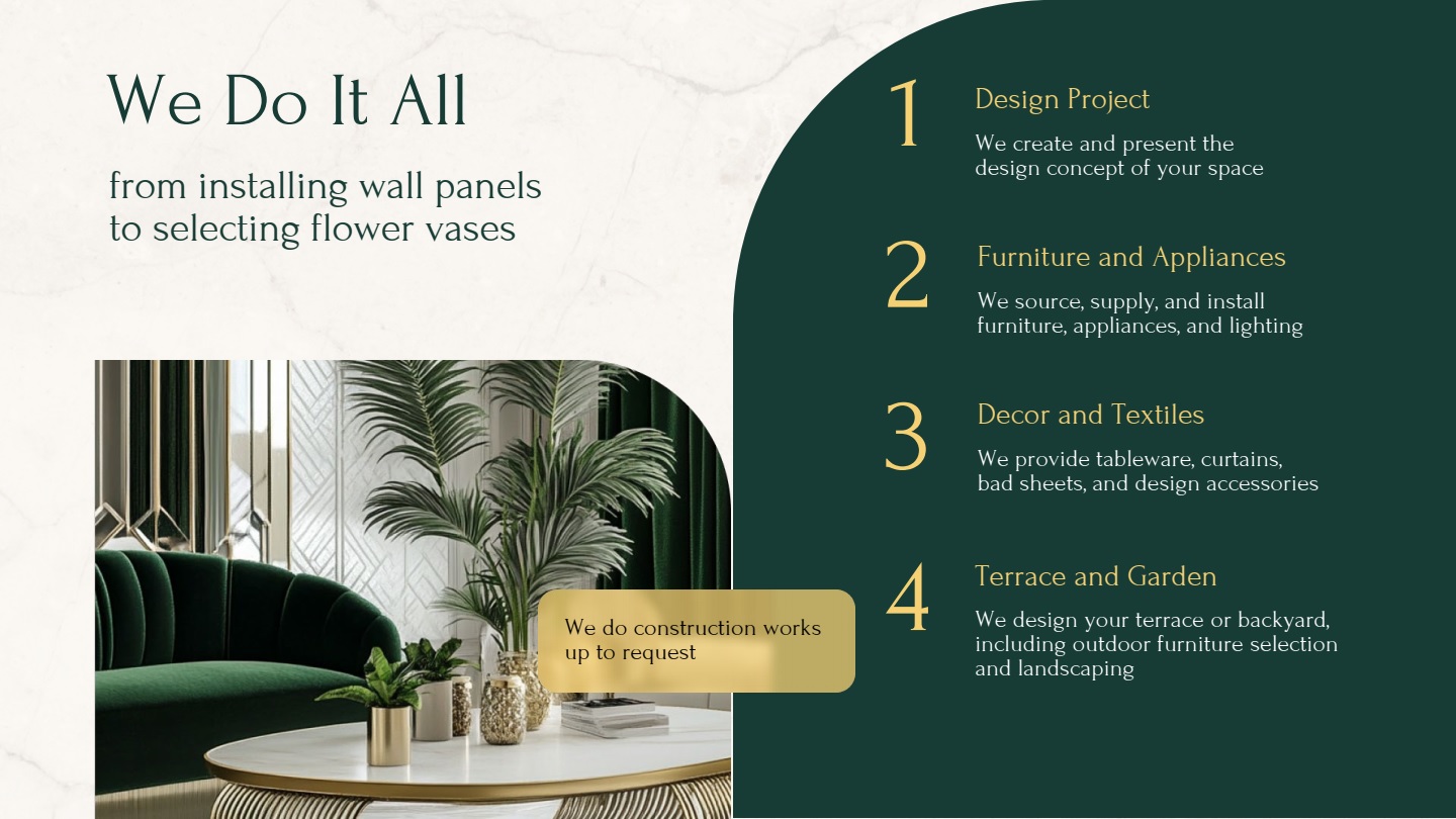 We offer comprehensive turnkey services for renovation, interior design, and furnishing of apartments, villas, and offices across the UAE. Whether you're preparing a property for personal use or for rental, we handle the entire process — from concept design to curtains on the windows and greenery on the terrace.